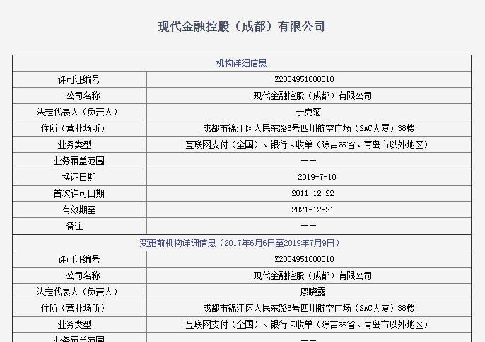 现代金融控股(成都)有限公司,以下是支付牌照信息,以下图片来源于中国人民银行官网。